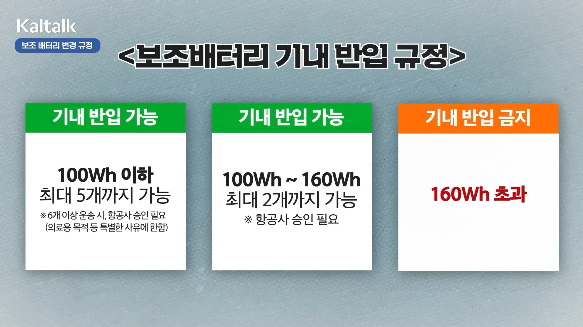| 100Wh 이하 | 1인당 최대 5개 | - 별도 승인 불필요 |